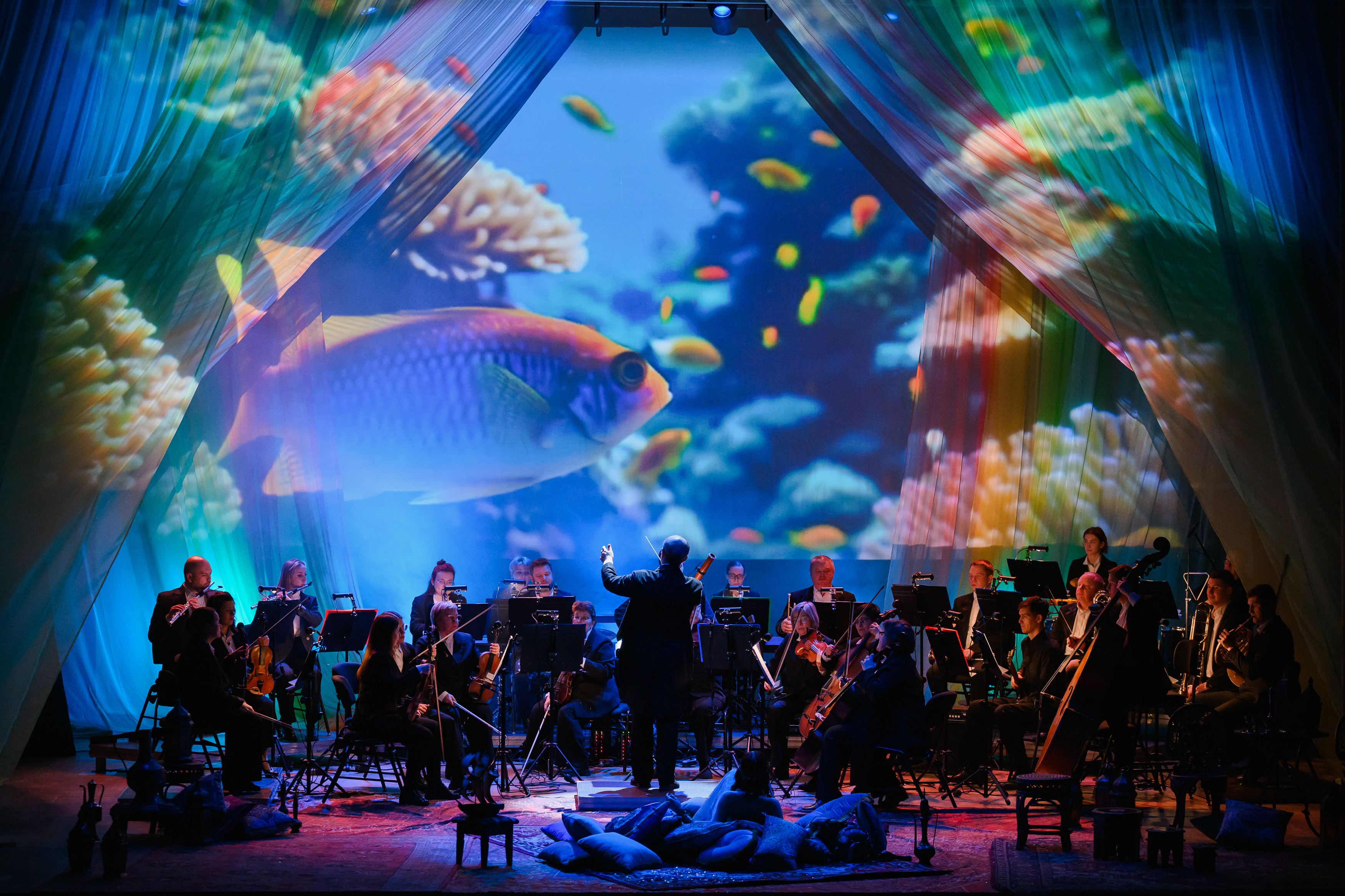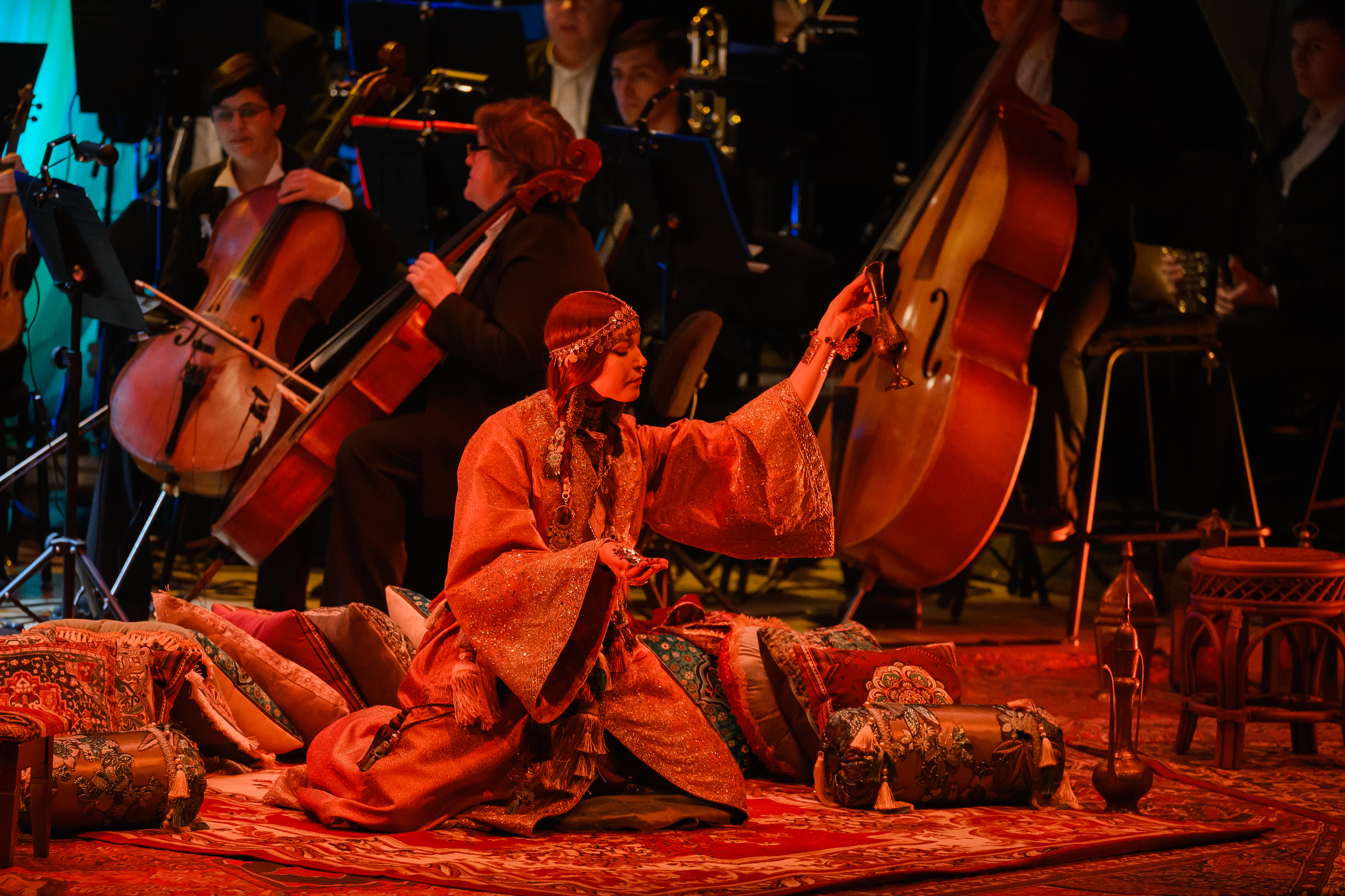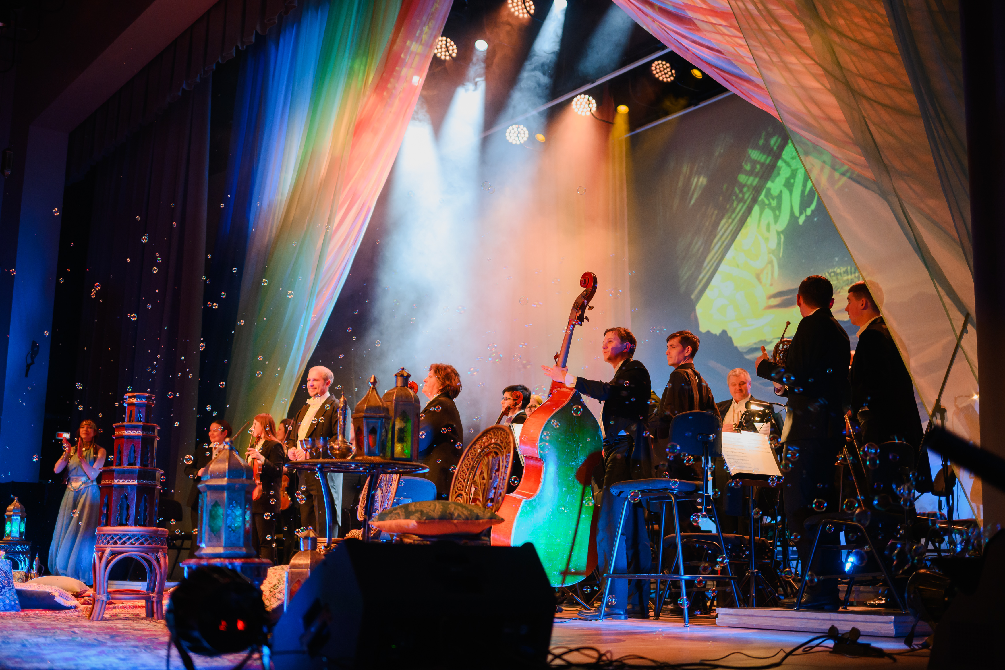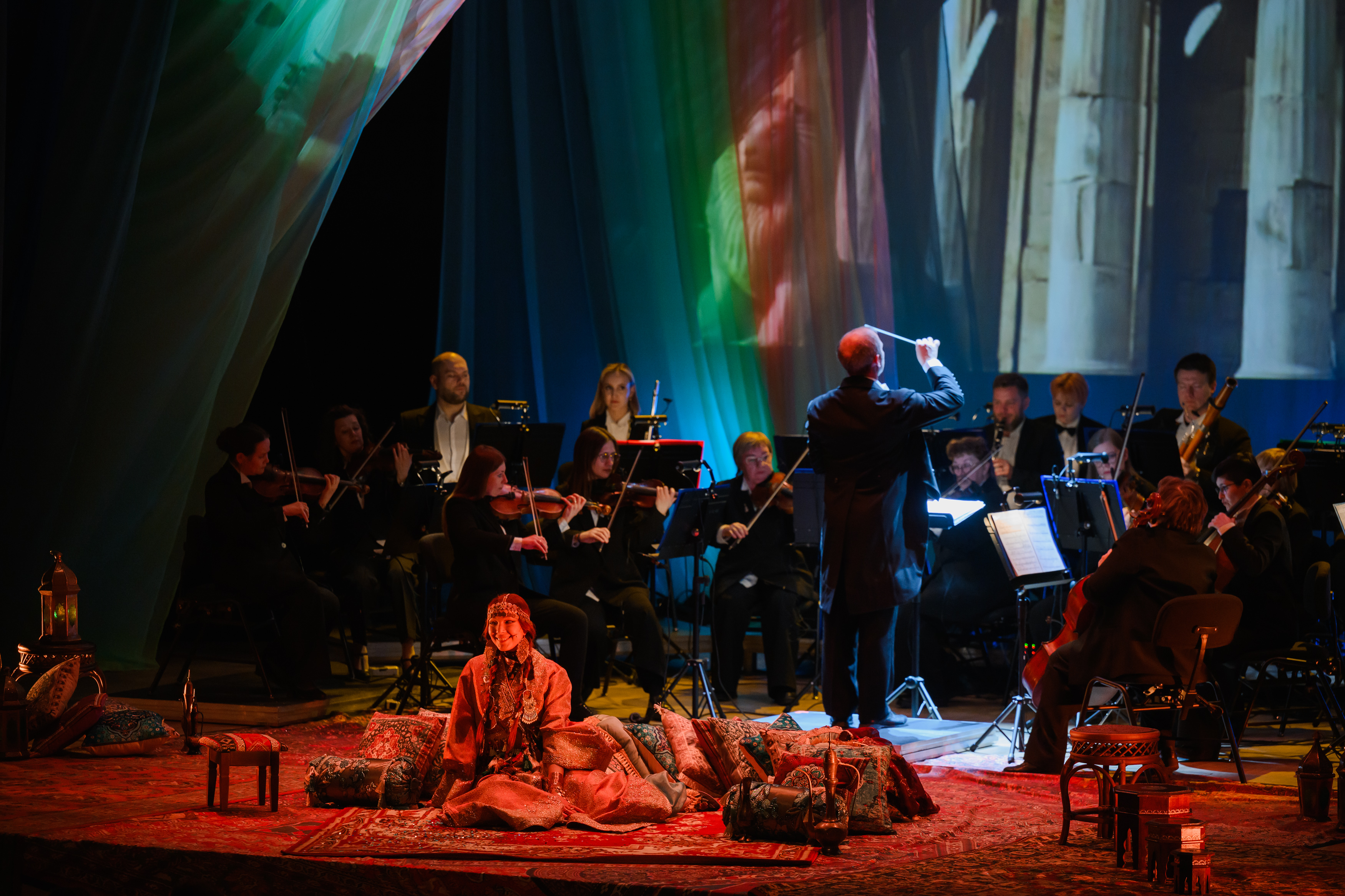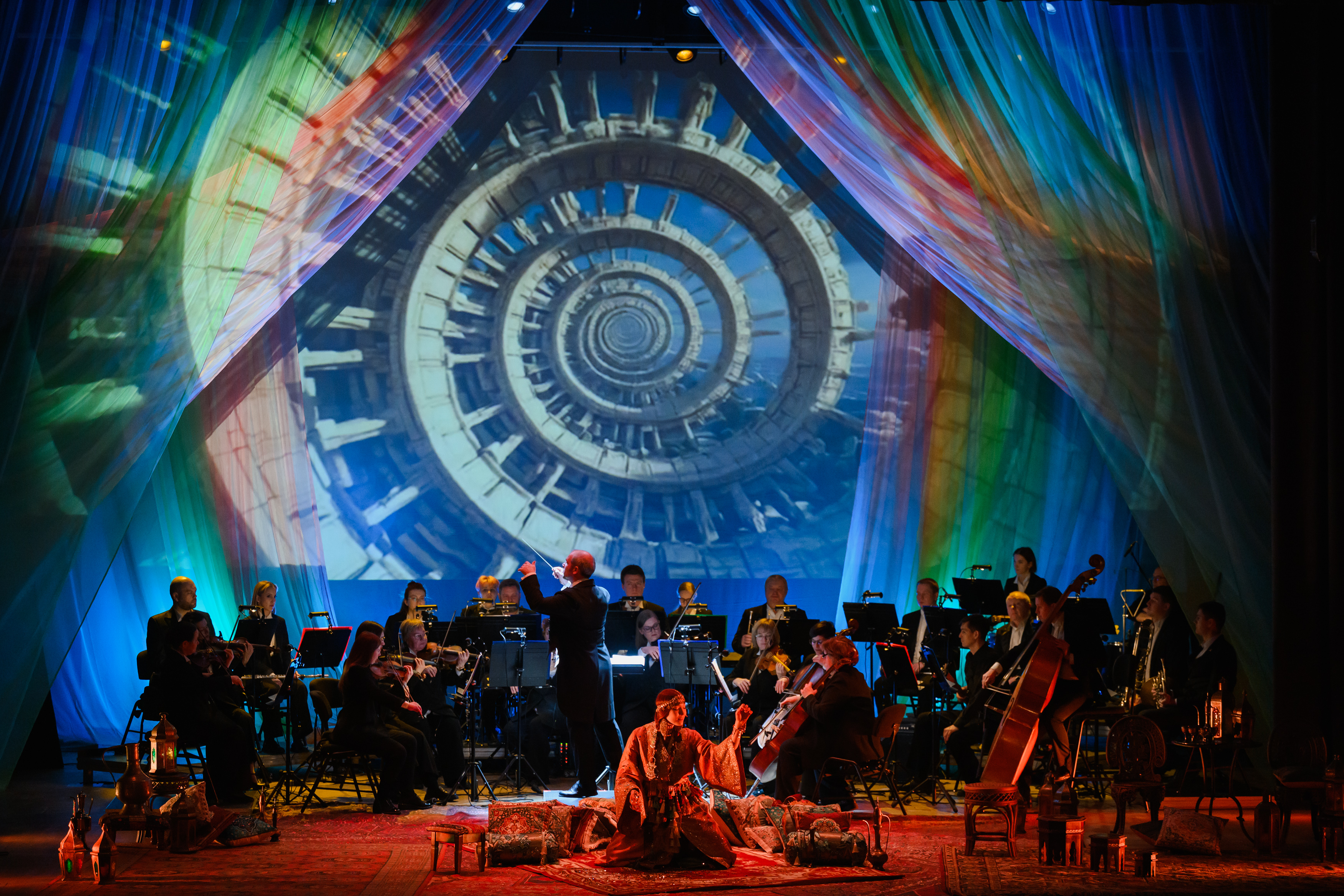 На протяжении всего повествования со сцены будет звучать симфоническая сюита «Шехеразада» Римского-Корсакова в исполнении полного состава оркестра Театра-Театра. Классическая музыка в тандеме с голосом прекрасной Шехеразады, фантастические видеокартины и лазерная проекция оживят волшебную арабскую сказку, наполненную жизненной мудростью и добротой.