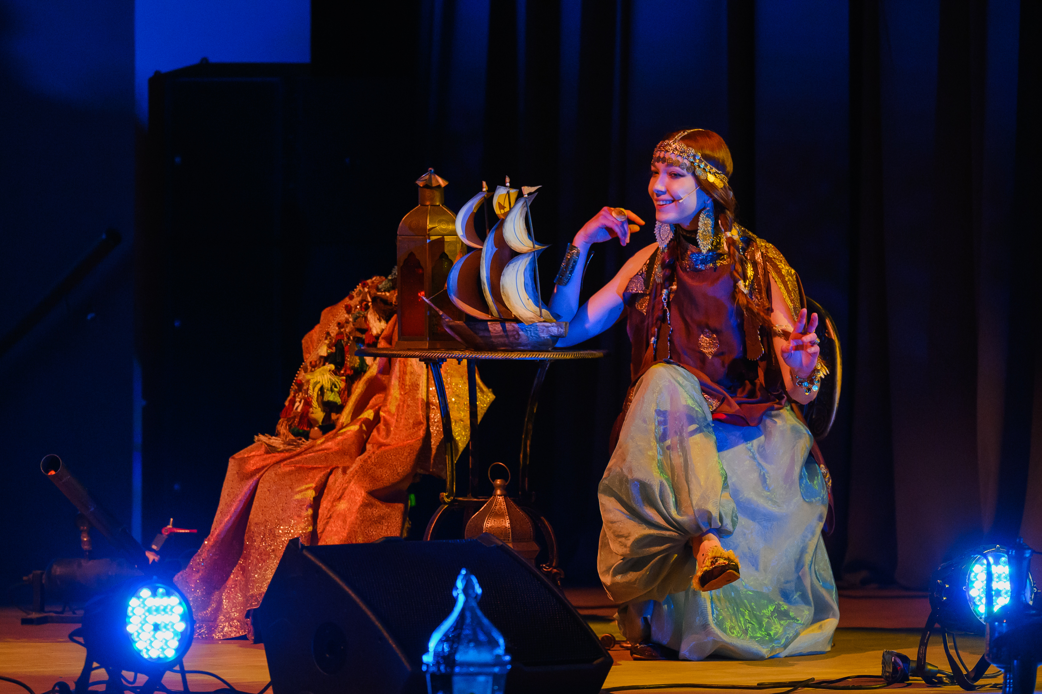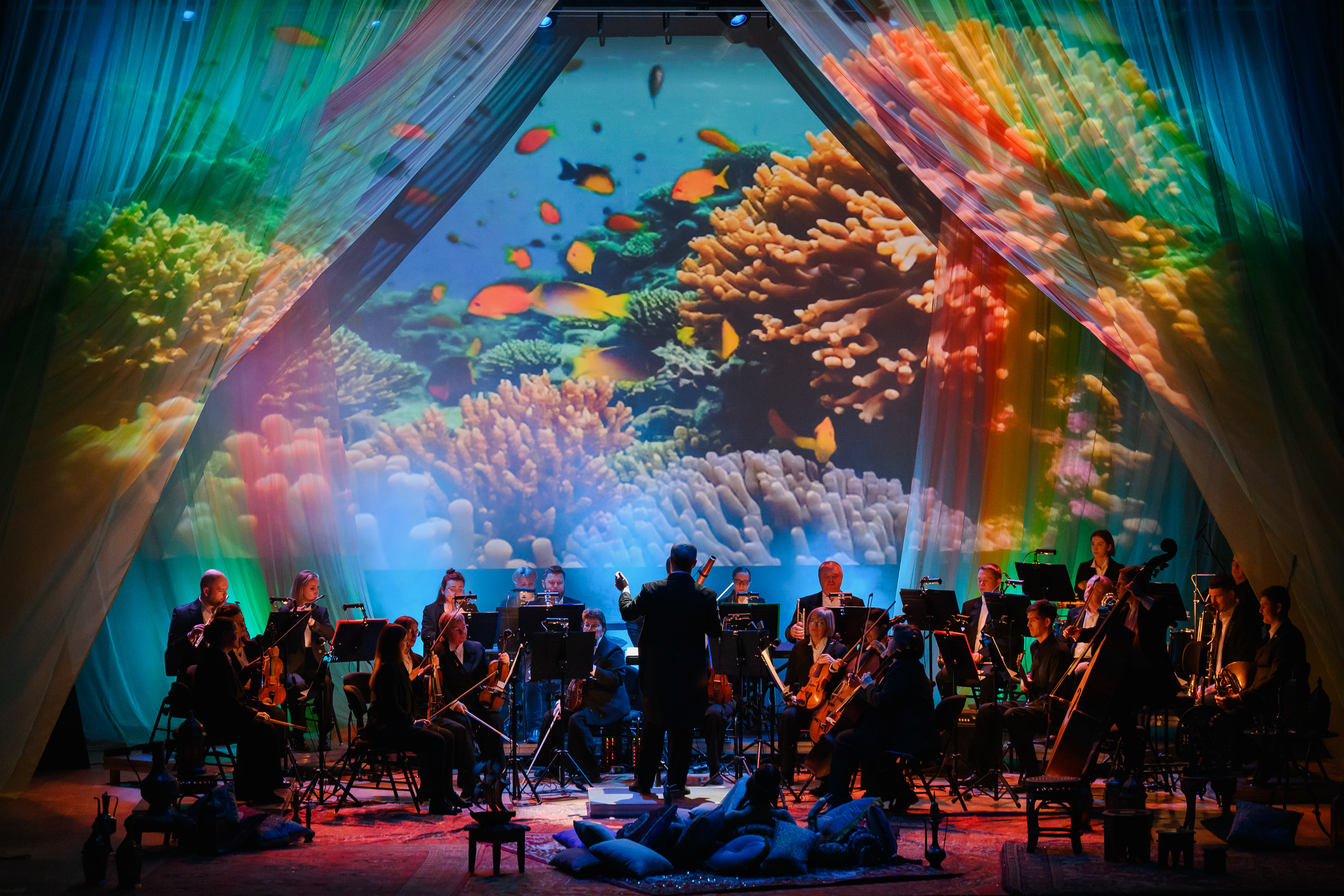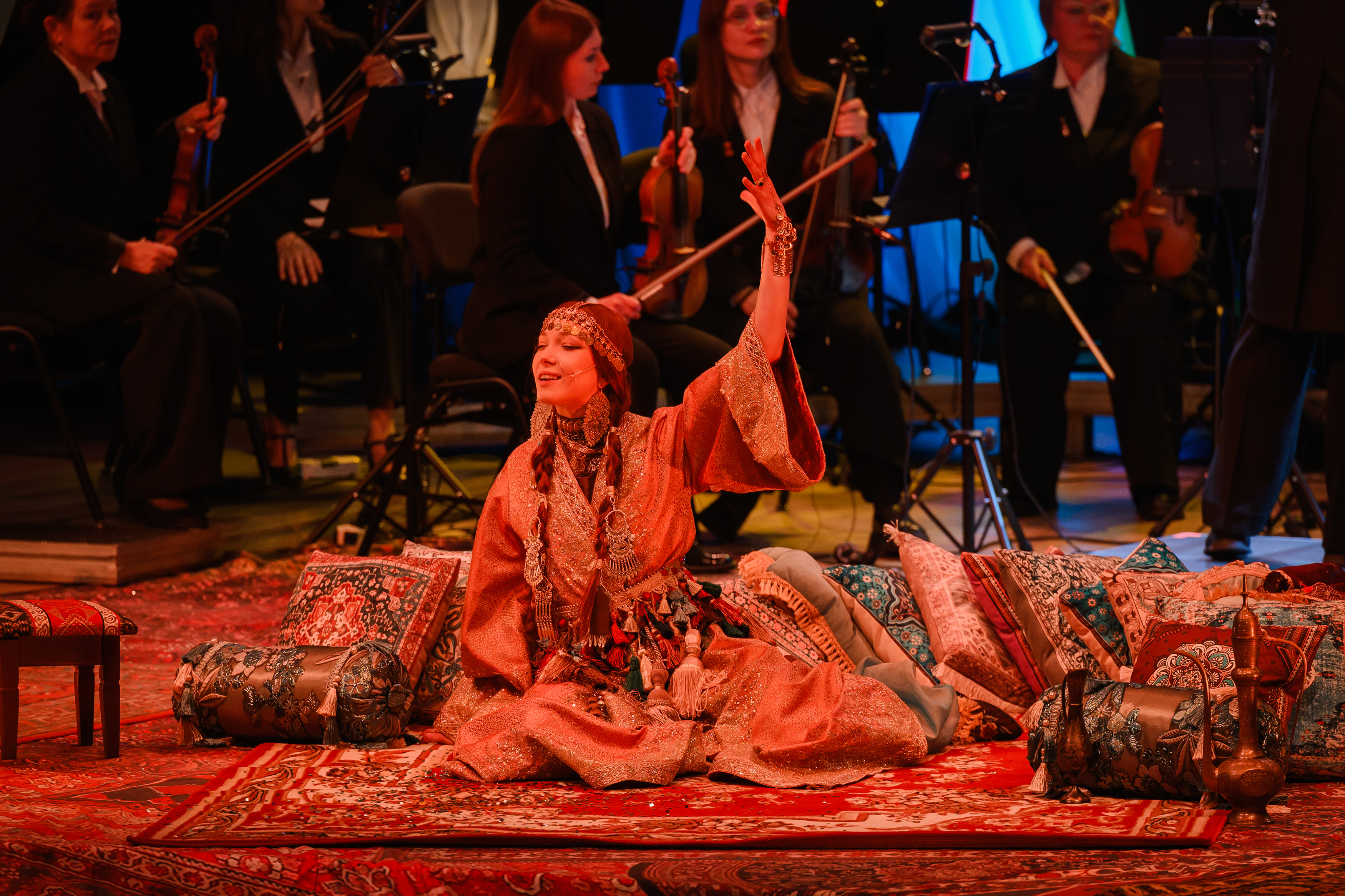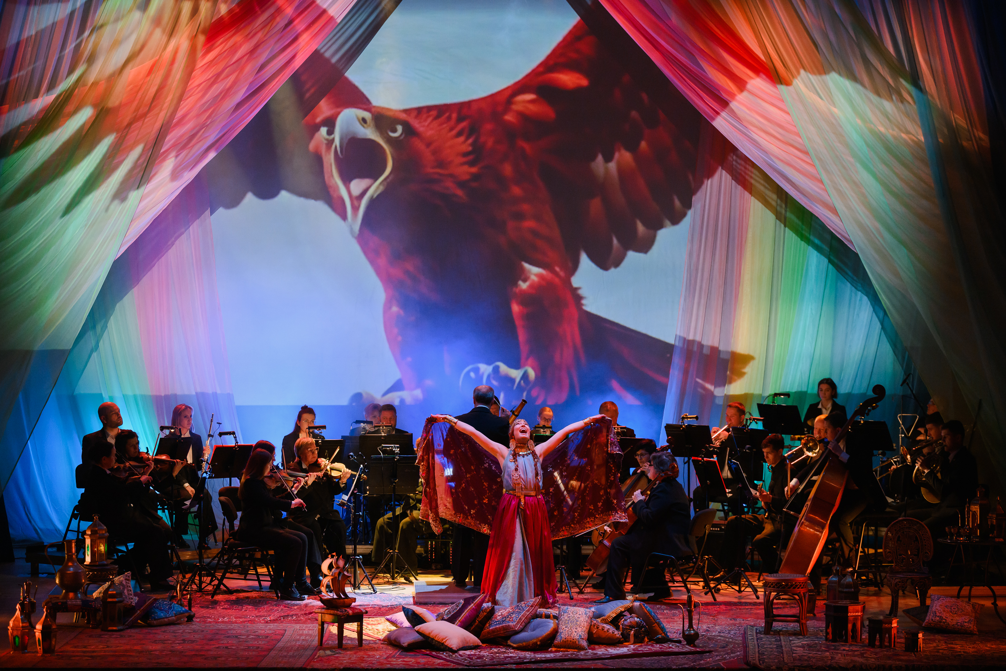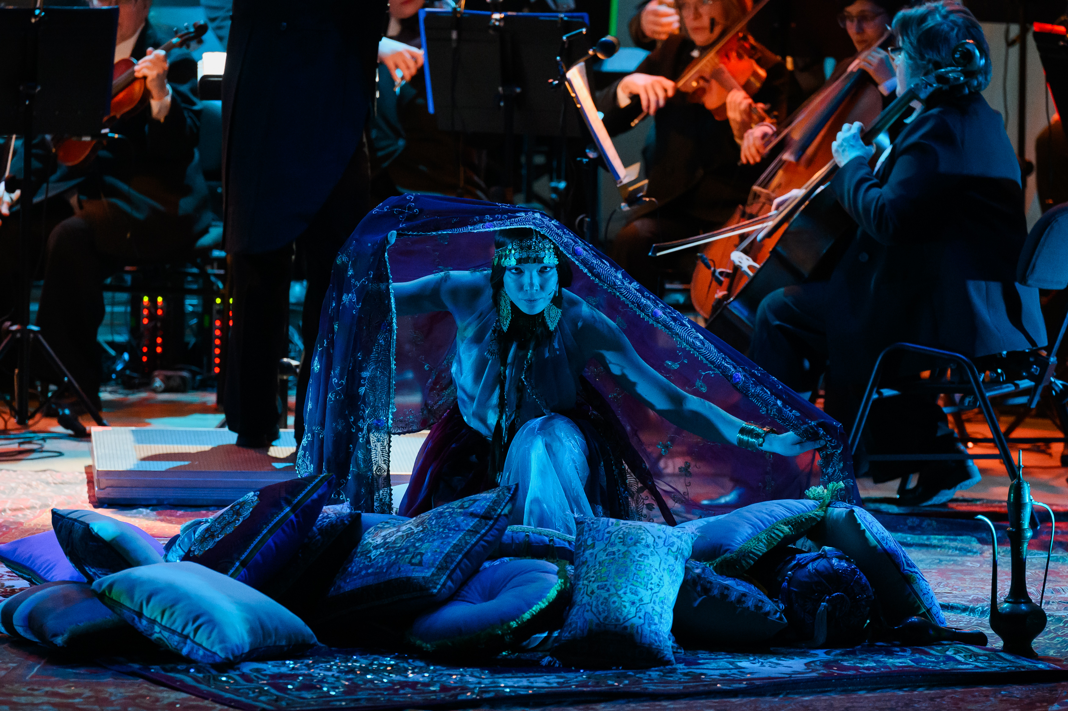 На протяжении всего повествования со сцены будет звучать симфоническая сюита «Шехеразада» Римского-Корсакова в исполнении полного состава оркестра Театра-Театра. Классическая музыка в тандеме с голосом прекрасной Шехеразады, фантастические видеокартины и лазерная проекция оживят волшебную арабскую сказку, наполненную жизненной мудростью и добротой.